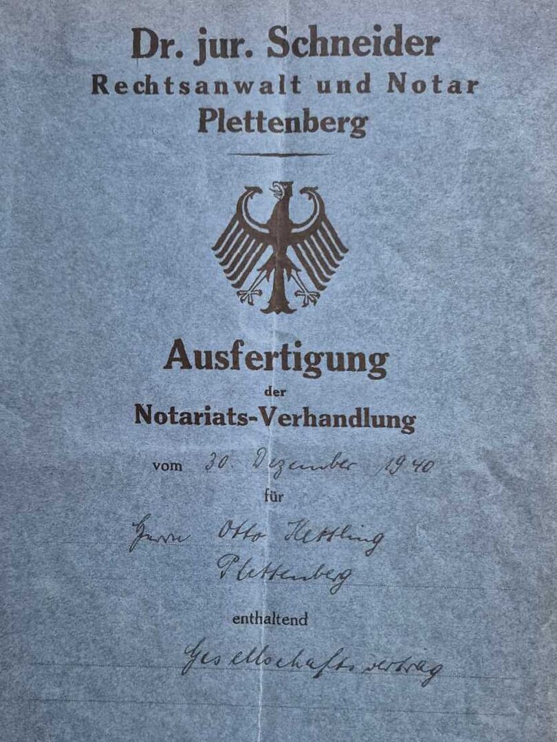 Registration of the company “Kettling & Co. KG” in the commercial register by Otto and Friedrich Wilhelm Kettling on November 30th, 1940.